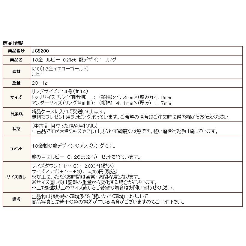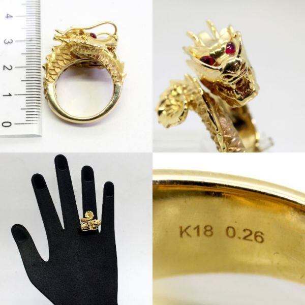 18金 ルビー 0.26ct 龍デザイン リング 14号 【中古】